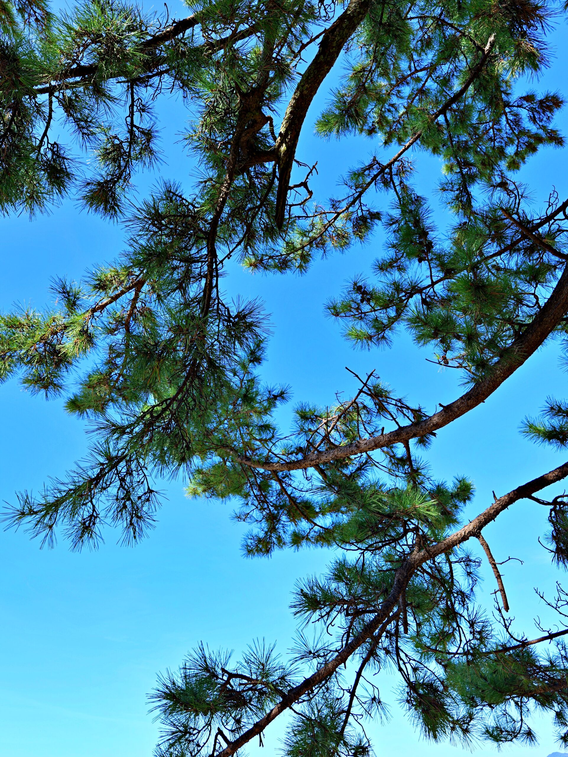 青空のグラデーションと松の葉が綺麗な縦写真です。